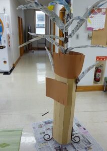 折り紙で飾りを作ったり、塗り絵をぬったり・・・その中で秋を象徴する木を作ることとなり、準備を進めてきました。はじめはどうなることかと思いましたが、本番が近づくにつれ、どんどんそれっぽさが増していきます。