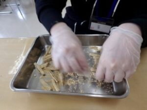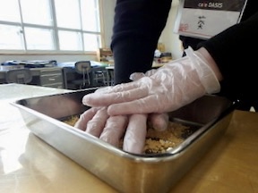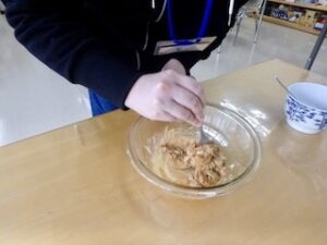 続いて、きな粉と温めたハチミツを混ぜ合わせます。
